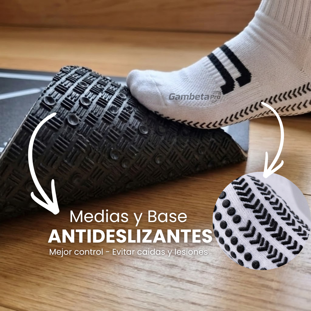 La base antideslizante y el uso con medias de agarre permiten entrenar con estabilidad y control, reduciendo riesgos y cuidando el cuerpo mientras juega.